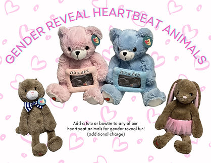 Planning a gender reveal? We offer heartbeat animals with a fun twist! Add a pink tutu or a blue bowtie for a small additional charge, making your reveal even more memorable.